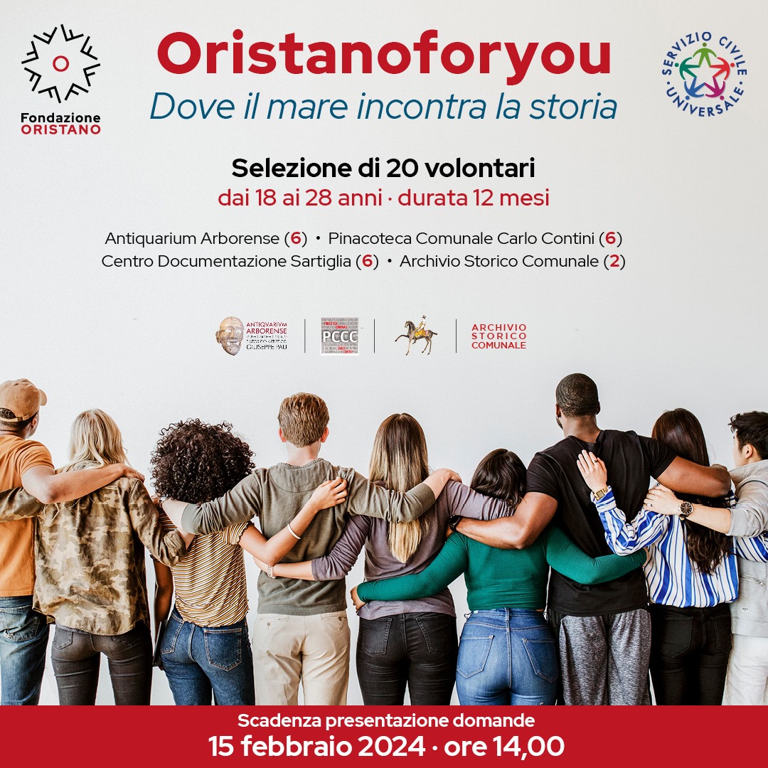 Il progetto della Fondazione Oristano, dal titolo “Oristanoforyou – Dove il mare incontra la storia”, è rivolto a 20 volontari che saranno impiegati per 12 mesi all’Antiquarium arborense, nell’Archivio storico comunale, nel Centro di documentazione della Sartiglia e nella Pinacoteca comunale Carlo Contini.
