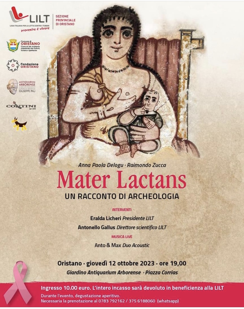 Nell’ambito della Campagna Nazionale Nastro Rosa 2023 per la prevenzione e la lotta contro il tumore del seno, la Lilt di Oristano in collaborazione con l'Antiquarium Arborense propone una Conferenza di Archeologia dal titolo "Mater Lactans" tenuta da Professor Raimondo Zucca (dell'Università di Sassari) e Anna Paola Delogu (Archeologa). La conferenza, accompagnata dalla musica live di Anto & Max - Duo Acoustic, verterà sulla figura femminile nel mondo dell’archeologia a partire dalla preistoria e di come è cambiata l’iconografia nell’ambito delle diverse civiltà. Nel corso della serata interverrà la Presidente della Lilt Eralda Licheri e il Direttore Scientifico Antonello Gallus.