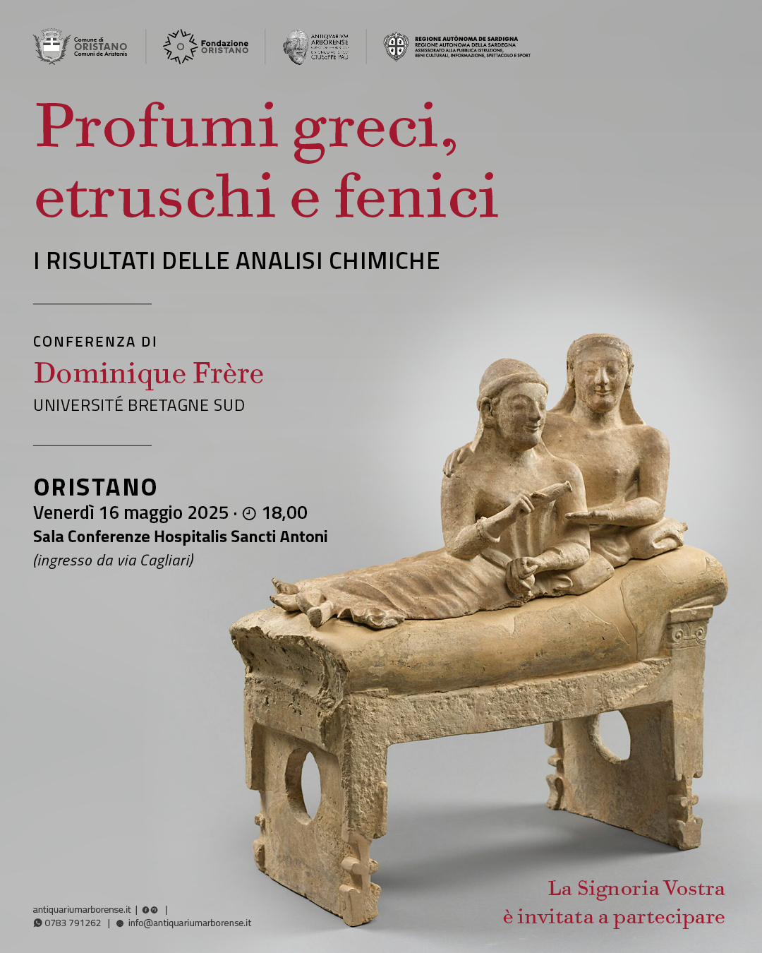 La conferenza si concentrerà sui vasi da profumo greci, etruschi, fenici e punici, scoperti in Sardegna nel VII-V secolo a.C. Verranno presentati i risultati delle analisi chimiche effettuate anche sui vasi dell’Antiquarium Arborense per determinarne il contenuto. I risultati rivelano un mondo di profumi di grande originalità e diversità, con essenze di origine sia orientale che locale.