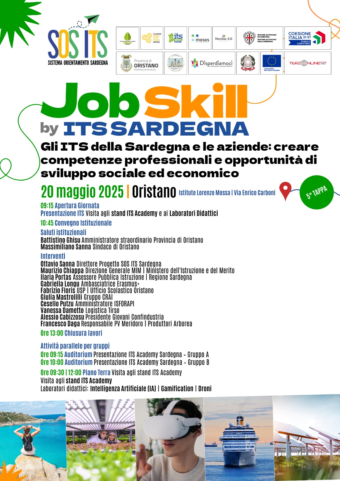 La Provincia di Oristano ha aderito alla proposta della Fondazione dell’ITS Tagss- Filiera Agro Alimentare della Sardegna, per la partecipazione e l’organizzazione dell’EVENTO SOS ITS - “JOB SKILL” promosso dalla Regione Sardegna, con la finalità di far conoscere a tutti gli studenti frequentanti gli Istituti di istruzione superiore di 2° grado della Provincia, l’offerta formativa delle cinque Fondazioni ITS presenti in Sardegna, specializzate in ambiti tecnologici diversi e particolarmente radicate nell’attuale mercato del lavoro.
