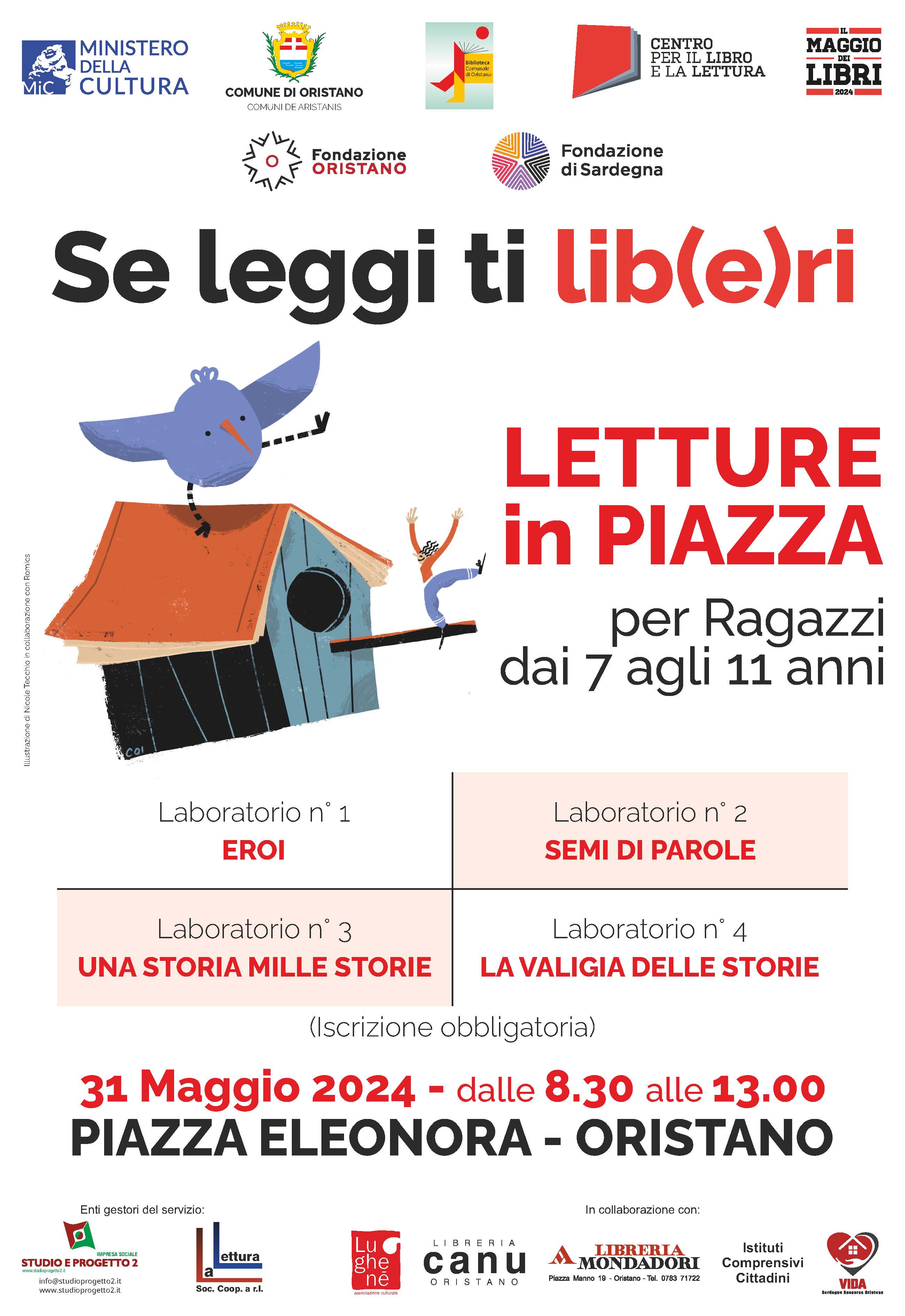 Quattro i laboratori proposti per promuovere la lettura tra i ragazzi nell’ambito del “Maggio dei libri” su iniziativa dell’Assessorato alla Cultura e delle Biblioteche comunali di Oristano in collaborazione con la Fondazione Oristano, le Cooperative Studio e progetto 2 e La Lettura, il Centro per il libro e la lettura, l’Associazione Culturale Lughenè, le librerie Canu e Mondadori e gli istituti comprensivi cittadini.