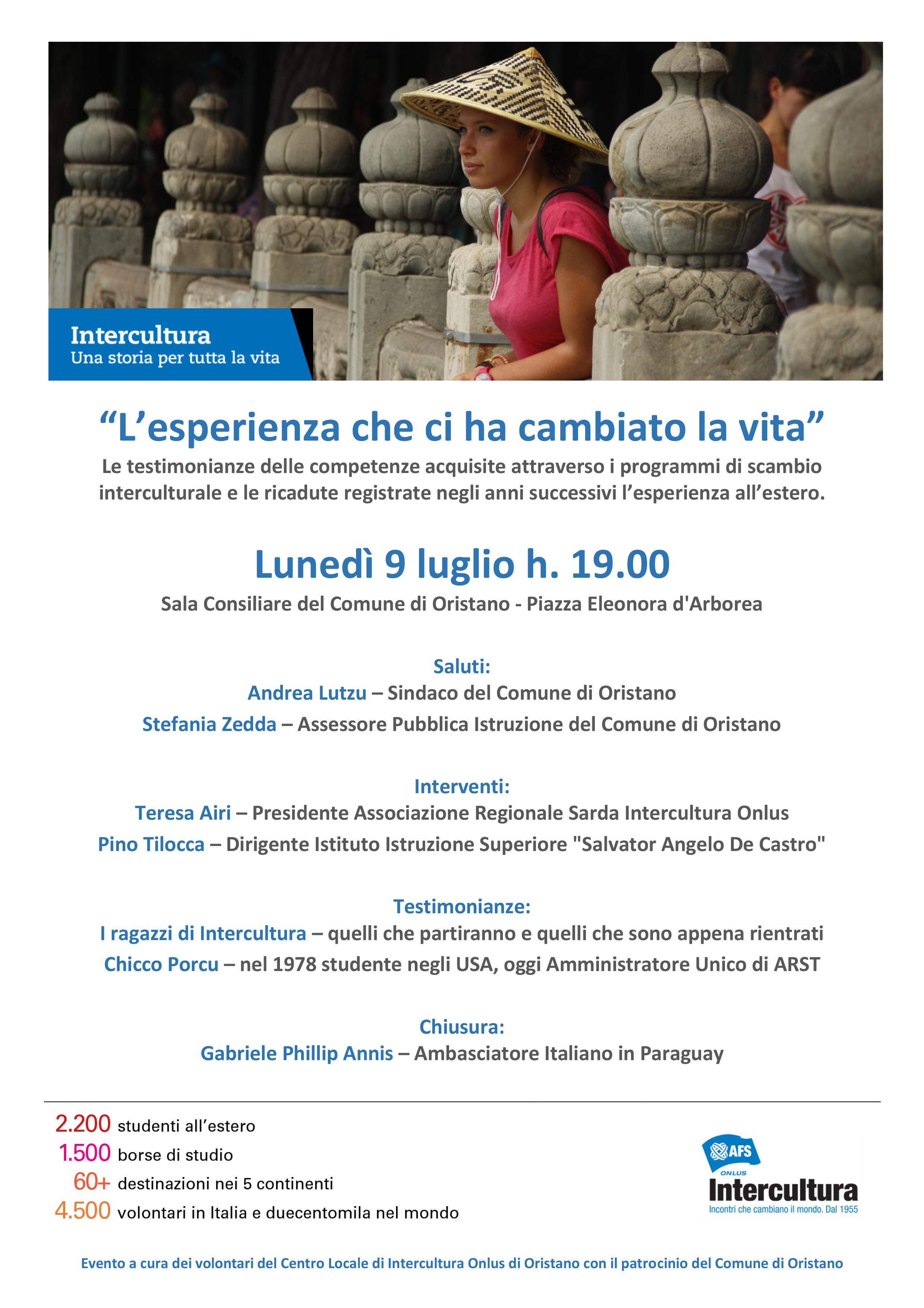 Lunedì 9 luglio alle 19.00 presso la sala consiliare del Comune di Oristano, i volontari del Centro Locale di Oristano di Intercultura Onlus invitano la cittadinanza all’incontro: “L’esperienza che ci ha cambiato la vita”.