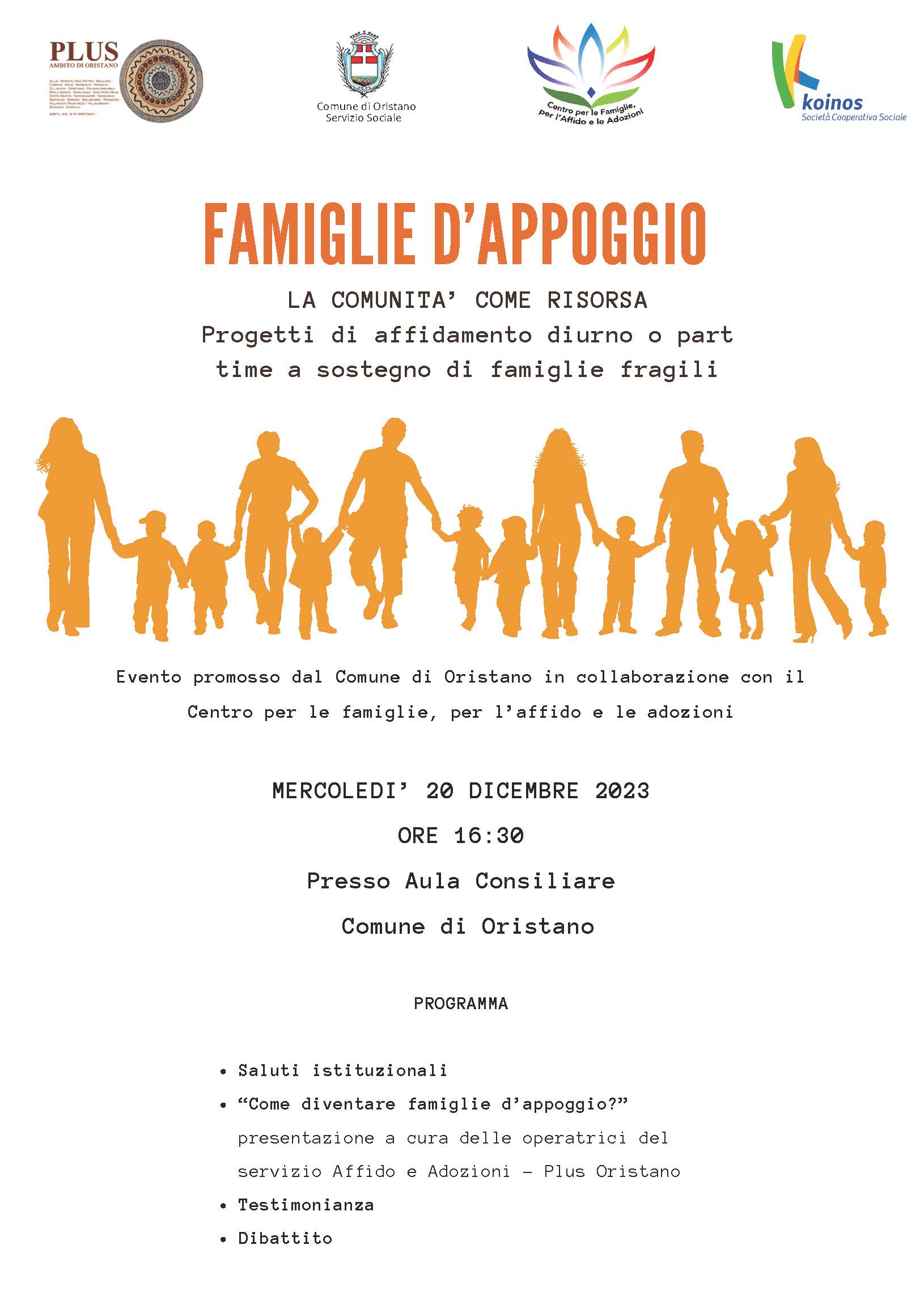 Mercoledì 20 dicembre 2023, alle 16:30, nella Sala consiliare del Comune di Oristano, "Famiglie d’appoggio la comunità come risorsa"