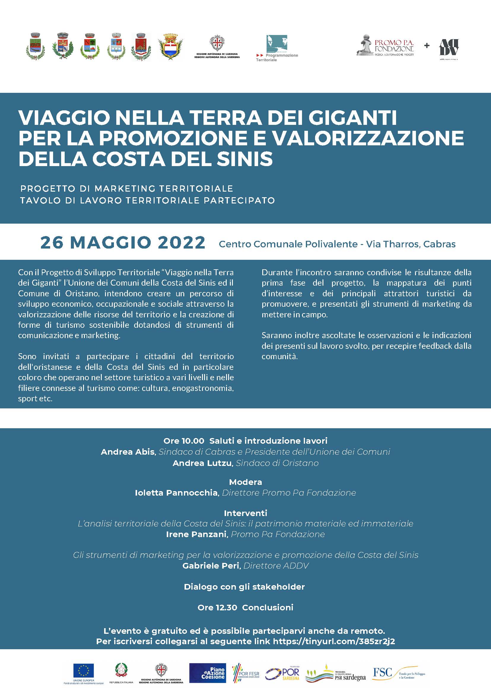 Giovedì 26 maggio, al Centro comunale polivalente di Cabras, si riunirà il tavolo di lavoro territoriale per la presentazione delle risultanze della prima fase del progetto “Viaggio nella terra dei giganti per la promozione e valorizzazione della costa del Sinis” e per presentare gli strumenti di marketing da
