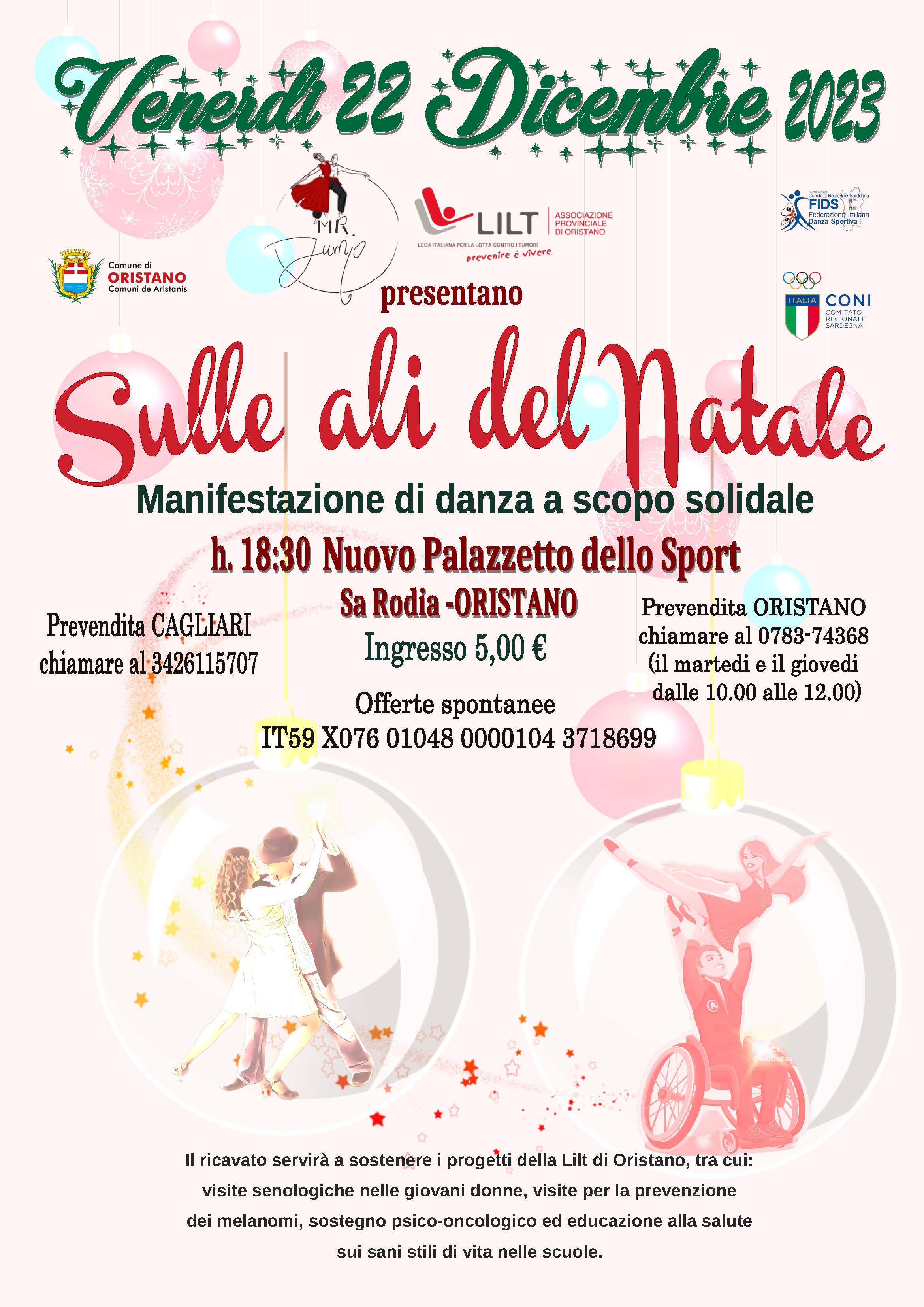 Venerdì 22 dicembre, alle 18.30, nel nuovo Palazzetto dello sport di Sa Rodia, la manifestazione di danza a scopo sociale. Il racavato servirà a sostenere i progetti della Lilt di Oristano e in particolare: visite senologiche, visite per la prevenzione dei melanomi, sostegno psico-oncologico ed educazione alla salute sui sani stili di vita nelle scuole.