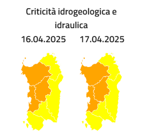 - codice ARANCIO (criticità MODERATA) per RISCHIO IDROGEOLOGICO e codice GIALLO (criticità ordinaria) per rischio IDRAULICO sulle aree di allerta Montevecchio Pischinappiu (che comprende anche Oristano), Tirso e Logudoro;