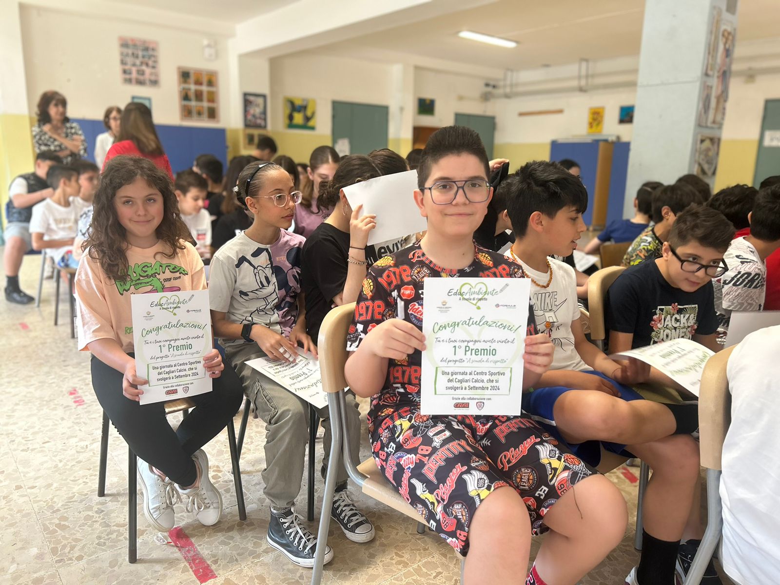 Alla premiazione hanno preso parte l’Assessore all’Ambiente del Comune di Oristano Maria Bonaria Zedda, la Dirigente scolastica Giuseppina Loi e la Responsabile marketing di Crai, Valentina Usai. Grazie al coinvolgimento del noto gruppo di distribuzione sardo, da sempre attento ai temi di sostenibilità ambientale, i 90 ragazzi saranno protagonisti di una giornata intera da trascorrere al centro sportivo del Cagliari Calcio, di cui Crai è main sponsor. L’evento si terrà a settembre, alla ripresa dell’anno scolastico, ma oggi è stata consegnata agli alunni una pergamena che sancisce la vittoria del primo premio.