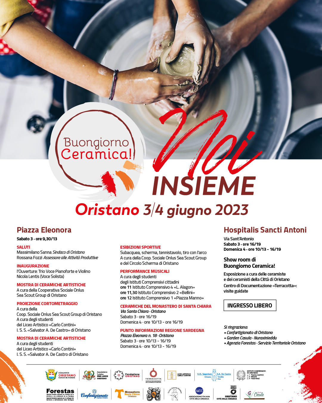 - Sabato 3 giugno ore 16/19 e domenica 4 giugno ore 16/19 all’Hospitalis Sancti Antoni Show room di Buongiorno Ceramica! con esposizione a cura delle ceramiste e dei ceramisti della Città di Oristano e visite guidate al Centro di Documentazione Terracotta.