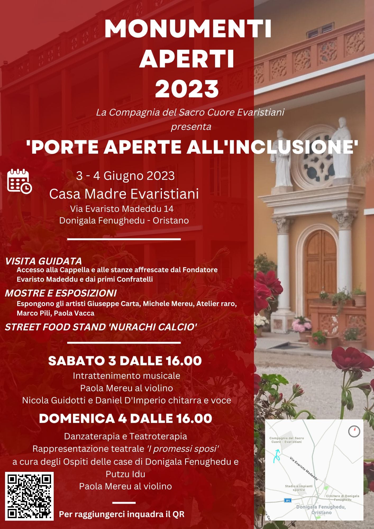 - Sabato 3 e domenica 4 giugno – Casa Madre Evaristiani (Donigala Fenughedu) Porte aperte all’inclusione, visite guidate, mostre ed esposizioni, street food stand “Nurachi calcio”