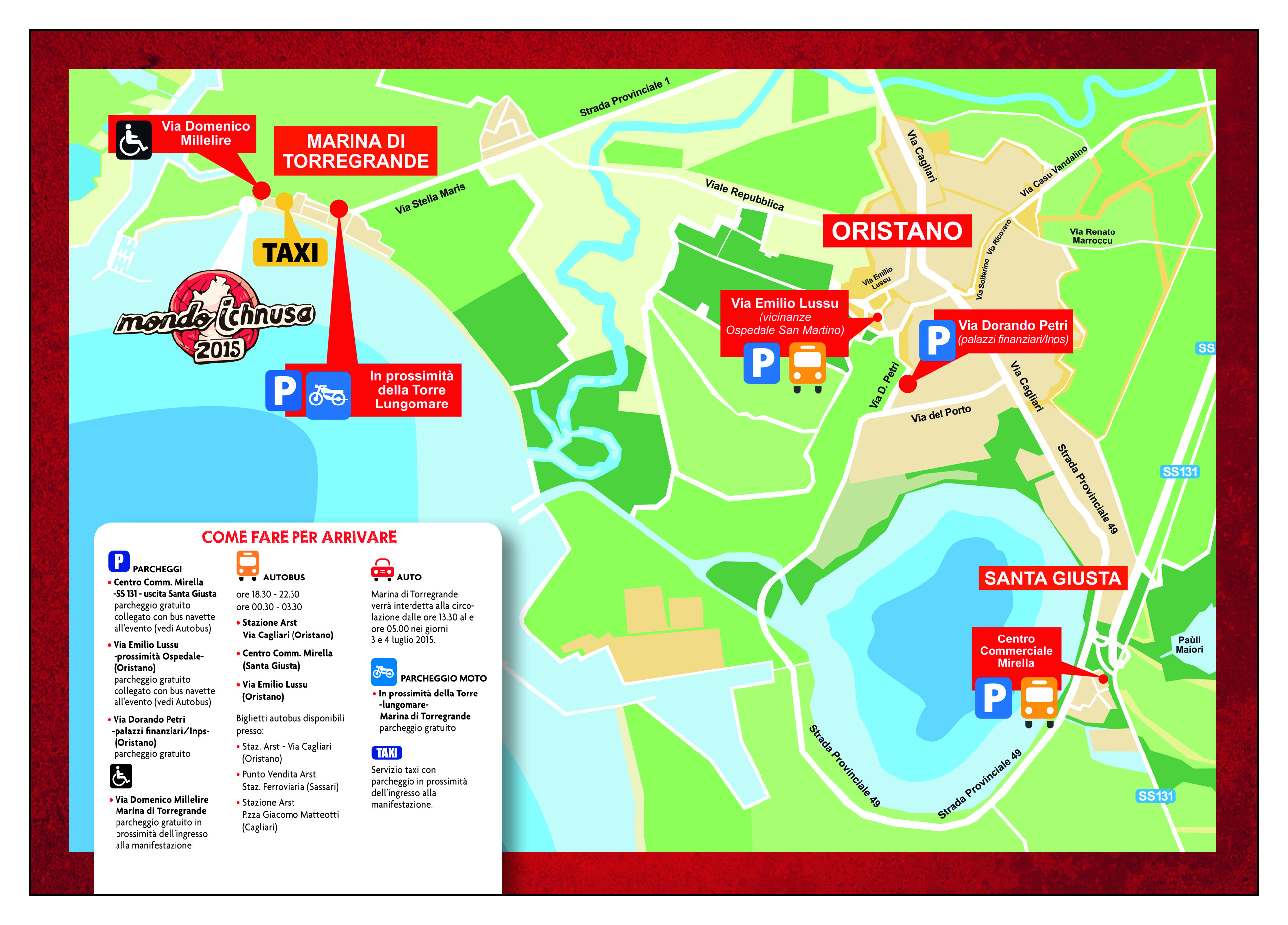 L’ARST ha iniziato la vendita dei biglietti per i bus-navetta di collegamento tra Oristano e Santa Giusta e Torre Grande. I bus-navetta effettueranno i trasporti (senza fermate intermedie) all’andata dalle 18.30 alle 22.30 e al ritorno dalle 00.30 alle 3.30 da Torre Grande. I punti di raccolta dei passeggeri saranno posizionati a Santa Giusta nel parcheggio del Centro commerciale Mirella a ridosso della Strada Statale 131, a Oristano nella stazione ARST di via Cagliari e nella via Lussu (pressi Provincia). Un altro bus-navetta opererà (senza fermate intermedie) da Piazza della Torre al Porticciolo turistico. Il servizio di trasporto pubblico urbano verso Torre Grande effettuerà le normali corse senza modifiche fino alle 18.30. I biglietti per le navette (costo 3 Euro valevoli andata e ritorno) sono in vendita a Oristano presso la biglietteria Arst di via Cagliari, a Sassari nel punto vendita Arst della stazione ferroviaria, a Cagliari nella stazione Arst di Piazza Matteotti.