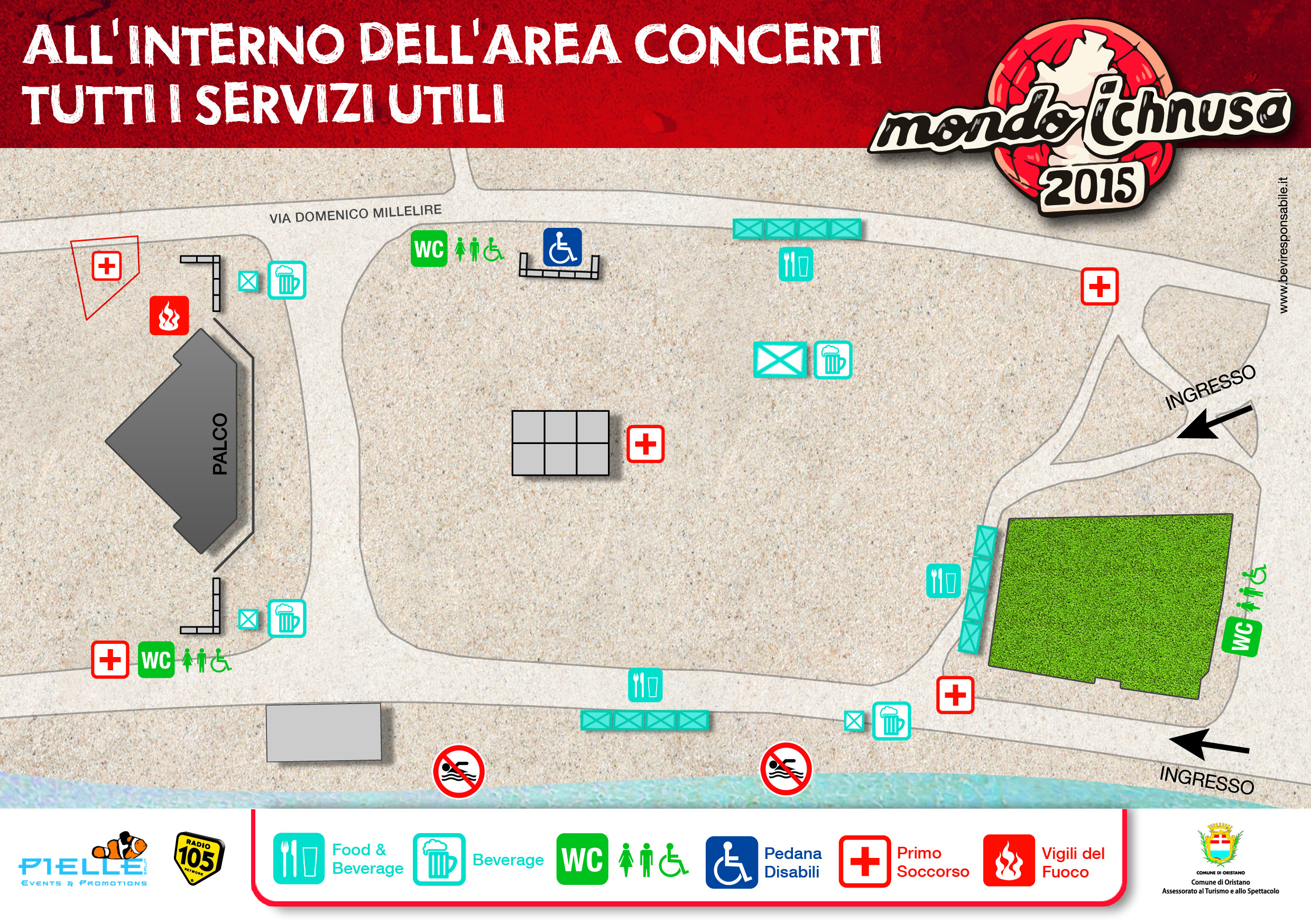 Nell’area del concerto sarà presenti più punti di primo soccorso e i servizi igienici, saranno potenziati i servizi a disposizione del pubblico con 24 punti di ristorazione dove oltre alla birra Ichnusa saranno serviti pesci, dolci, panini e bevande. Una tribuna sarà a disposizione dei disabili.