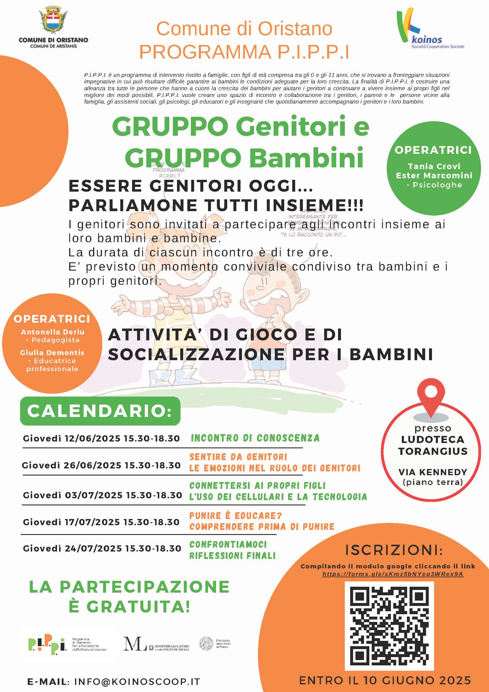 Il Comune di Oristano, nell'ambito del Programma PIPPI, organizza il secondo ciclo di incontri rivolto a genitori e bambini/ragazzi per parlare insieme di educazione e genitorialità. I gruppi genitori e bambini si svolgeranno contestualmente e saranno gestiti dagli operatori della Cooperativa Sociale Koinos.
