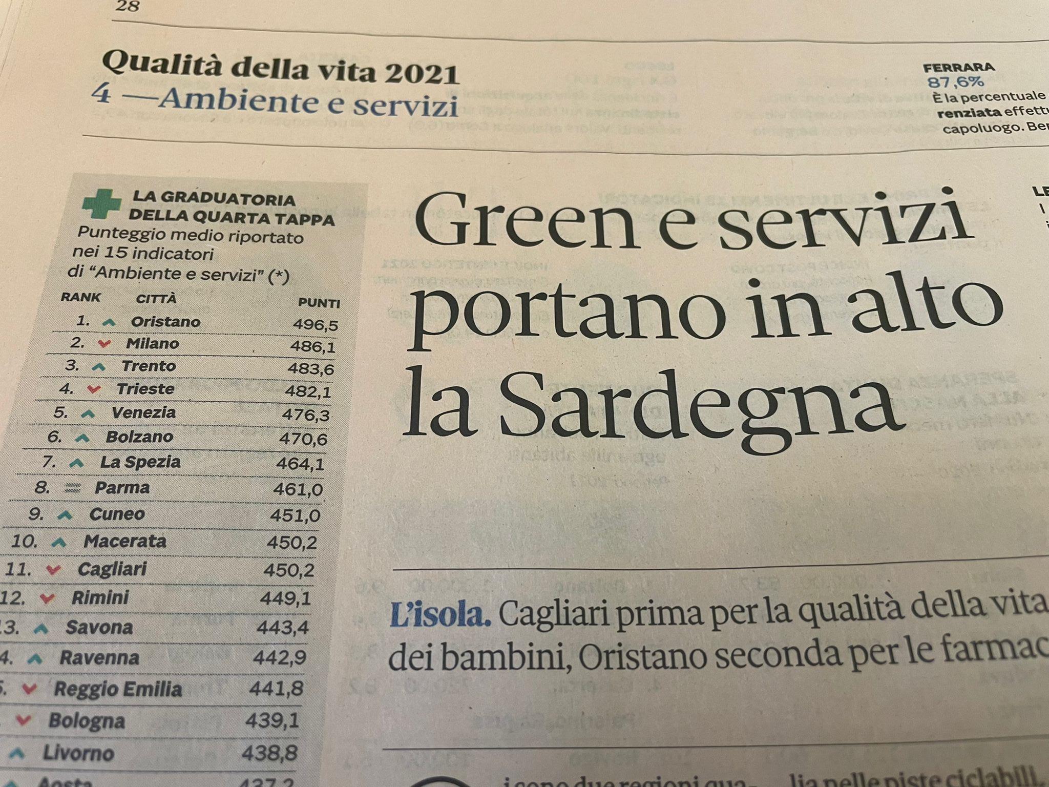 Nel rapporto annuale del Sole 24 ore sulla Qualità della vita Oristano conferma la 67esima posizione generale, la stessa del 2020, e viene premiata per l’eccellenza raggiunta su alcuni indicatori.