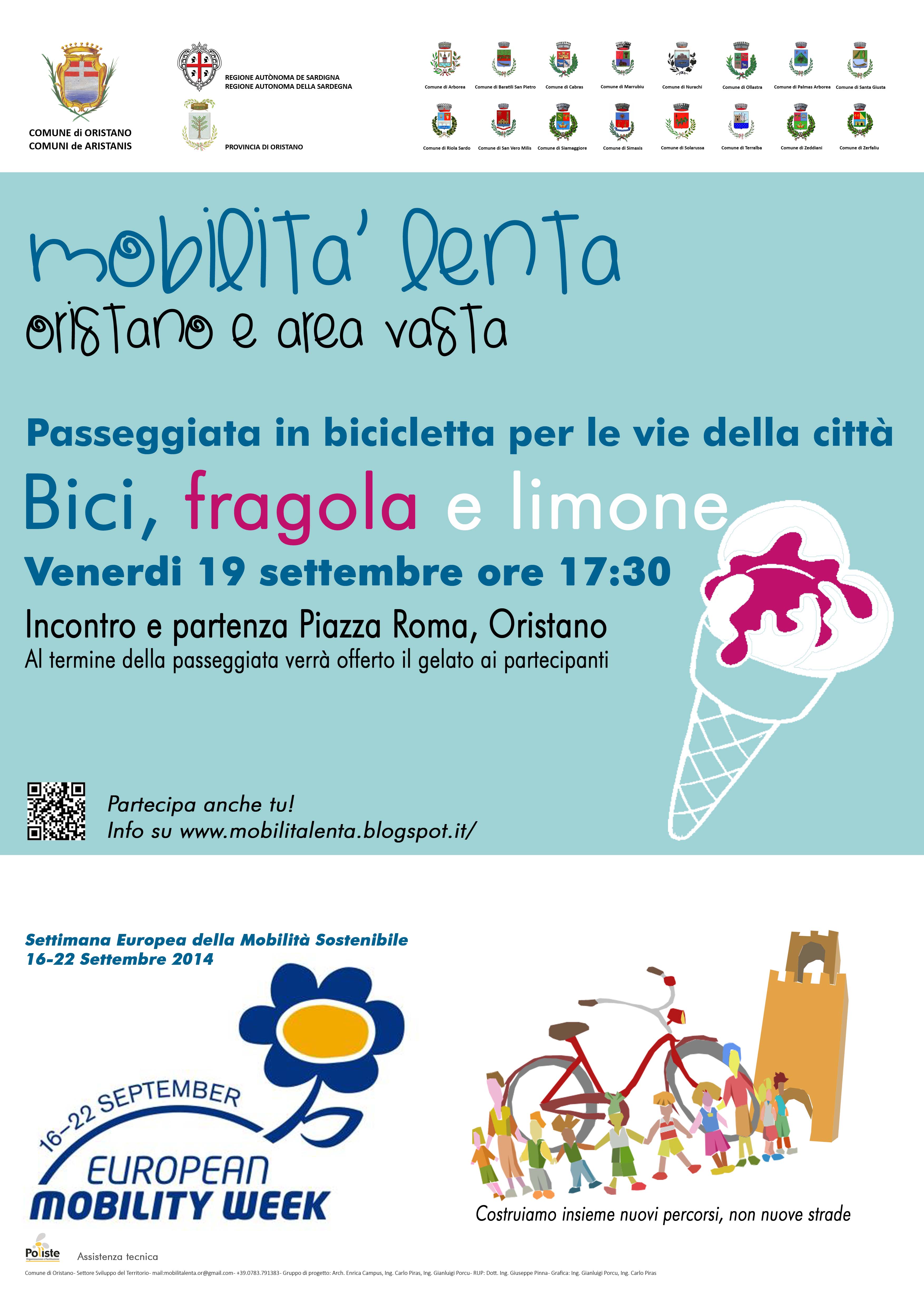 Venerdì 19 settembre, nell’ambito delle iniziative programmate dal Comune di Oristano e da altri 16 comuni (Arborea, Baratili San Pietro, Cabras, Marrubiu, Nurachi, Palmas Arborea, Ollastra, Riola Sardo, Santa Giusta, San Vero Milis, Siamaggiore, Simaxis, Solarussa, Terralba, Zeddiani e Zerfaliu) con il Progetto "Mobilità Lenta Oristano ed Area Vasta", per le vie della città si svolgerà una ciclo-passeggiata per promuovere la mobilità in bici.