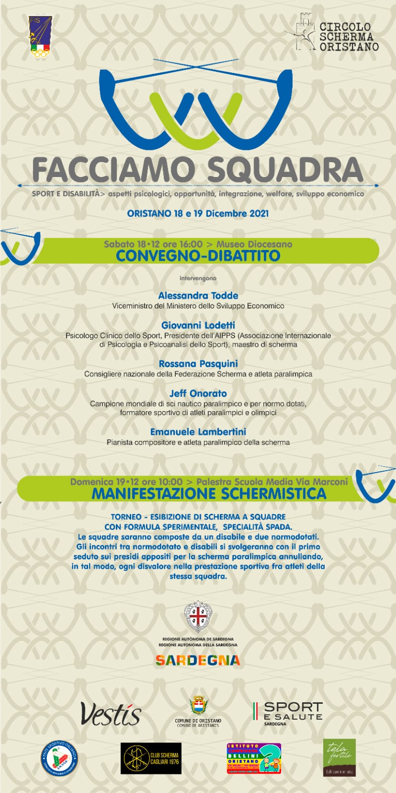 Il Circolo Scherma Oristano, in collaborazione con il Comune di Oristano, organizza la manifestazione “Facciamo squadra”, due giorni dedicati a sport e disabilità interpretati in un’ottica di politiche inclusive e di un welfare possibile.